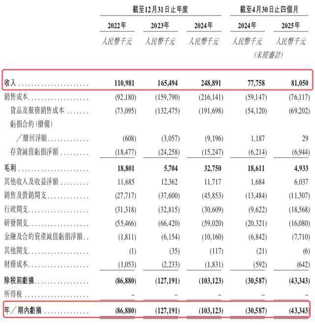 业绩方面,哥瑞利尚未实现盈利,2022年至2024年,公司收入分别为1.11亿元、1.65亿元、2.49亿元;亏损分别为8688.0万元、1.27亿元、1.03亿元。2025年前四个月,亏损4334.3万元,较上年同期扩大。