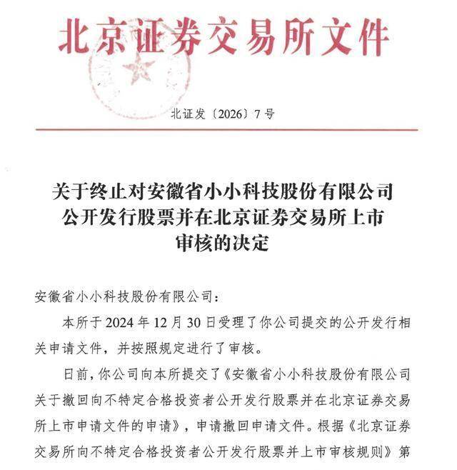 瑞财经 刘治颖 近日,北交所决定终止安徽省小小科技股份有限公司(以下简称:小小科技)公开发行股票并在北交所上市的审核,保荐机构为国元证券,保荐代表人为伏航、汤雨城,会计师事务所为天健。