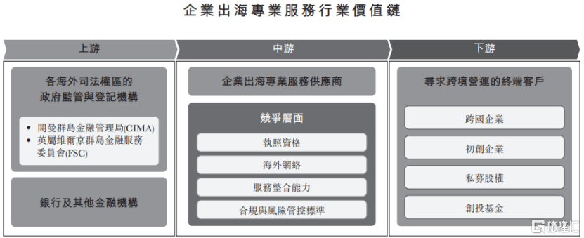 下游由各类寻求跨境营运的终端客户组成,包括跨国企业、初创企业,以及私募股权及创投基金等。