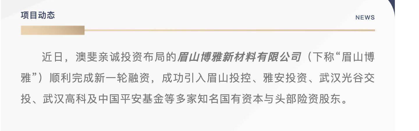 据澳斐亲诚公众号消息,近日,澳斐亲诚投资布局的博雅新材顺利完成新一轮融资,成功引入眉山投控、雅安投资、武汉光谷交投、武汉高科及中国平安基金等多家知名国有资本与头部险资股东。