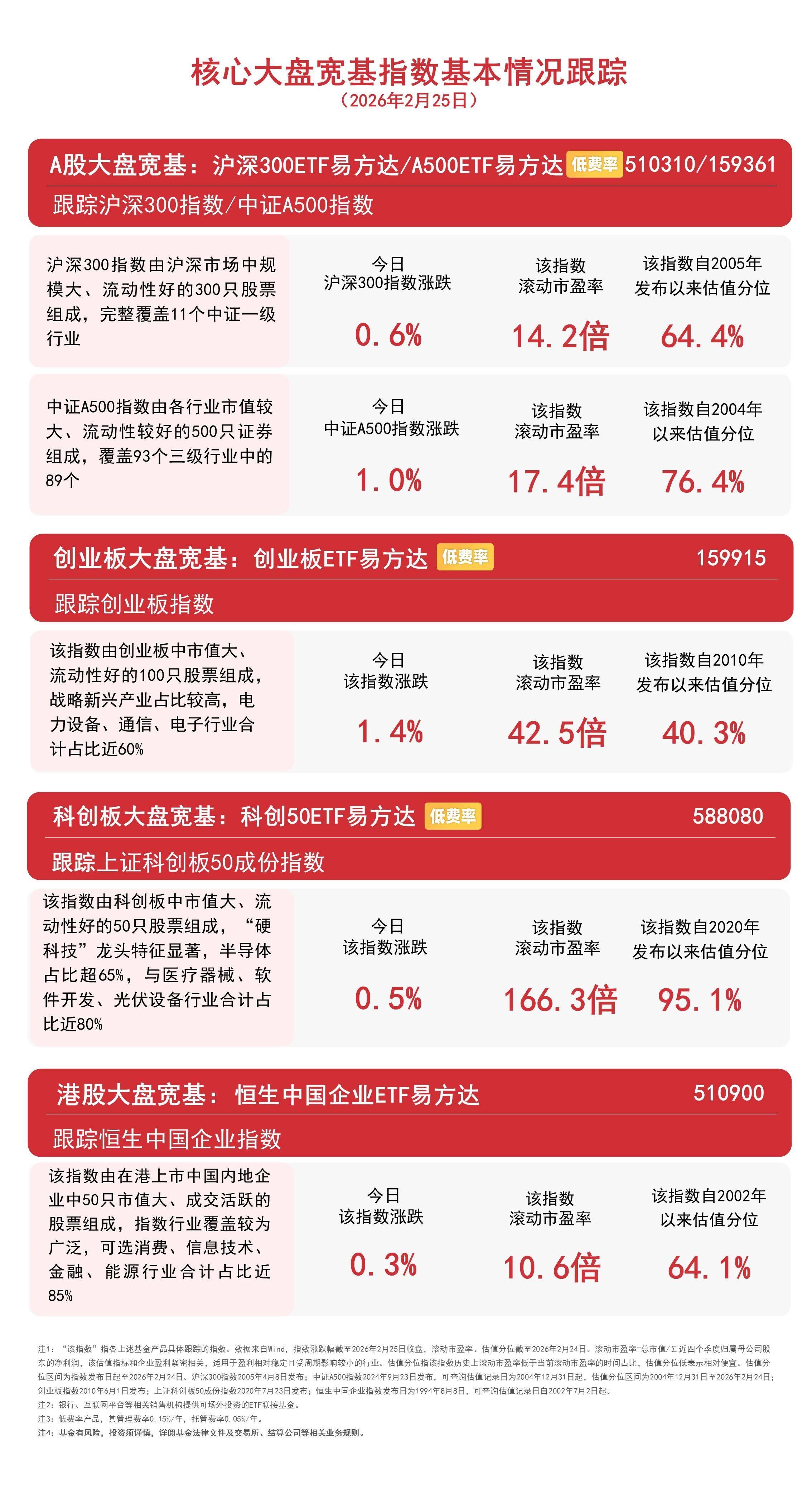 截至收盘,中证A500指数上涨1.0%,沪深300指数上涨0.6%,创业板指数上涨1.4%,上证科创板50成份指数上涨0.5%,恒生中国企业指数上涨0.3%。