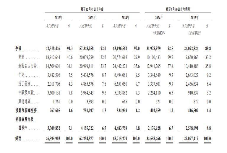 招股书显示,2025年上半年,传音控股智能手机的平均售价为547.5元/部,功能手机为50.1元/部。这也表明传音控股的手机产品组合仍然以中低端价格为主。