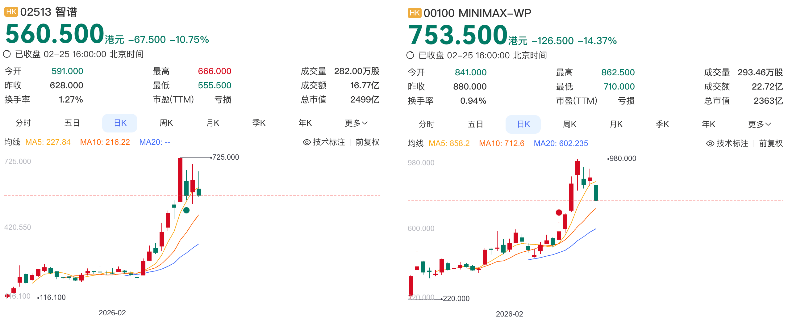 截至今日收盘,智谱的股价为560.5港元(约合人民币492元)/股,总市值2499亿港元(约合人民币2195亿元);MiniMax的股价为753.5港元(约合人民币662元)/股,总市值2363亿港元(约合人民币2076亿元)。