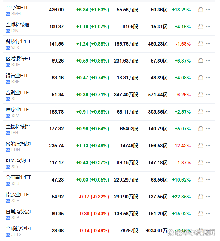 半导体ETF涨1.63%,全球科技股指数ETF涨1.07%,科技行业ETF涨0.88%,在美股盘初领跑行业ETF。
