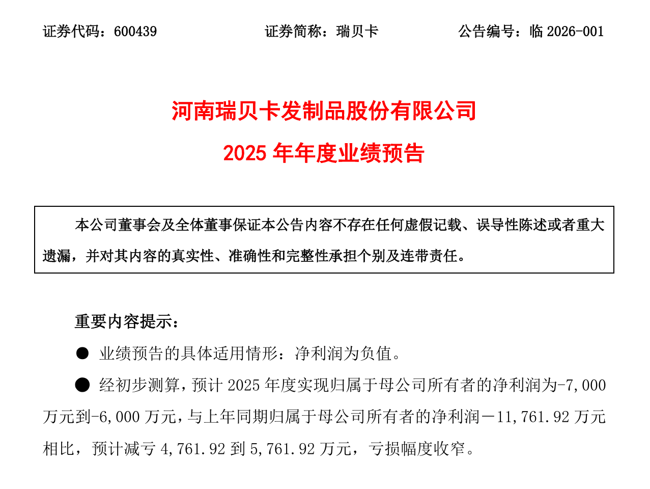 近日,“河南假发大王”瑞贝卡(600439.SH)发布2025年年度业绩预告,预计全年归属于母公司所有者的净利润为-7000万元到-6000万元,虽较上一年度亏损有所收窄,但仍深陷亏损泥沼。