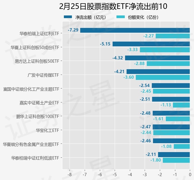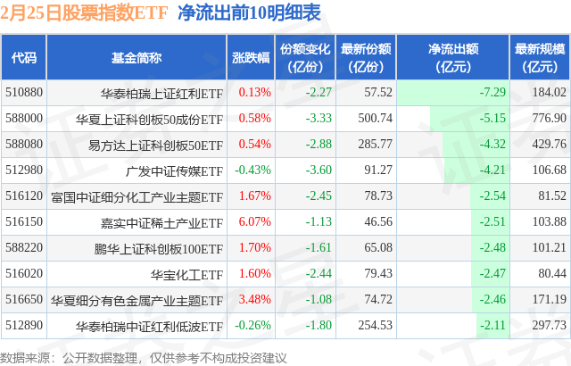 当日有224只股票指数ETF基金出现资金净流出,其中净流出排首位的是华泰柏瑞上证红利ETF(510880),份额减少了2.27亿份,净流出额为7.29亿元。