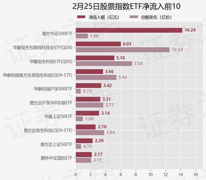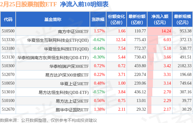 当日有192只股票指数ETF基金出现资金净流入,其中净流入排首位的是南方中证500ETF(510500),份额增加了1.66亿份,净流入额为14.24亿元。