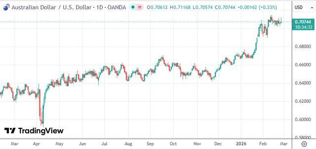 年初至今,澳元兑美元已累涨超6%,升至近三年来高位。本月早些时候,澳大利亚储备银行宣布将基准利率上调25个基点至3.85%,这也是该行两年多来首次加息。