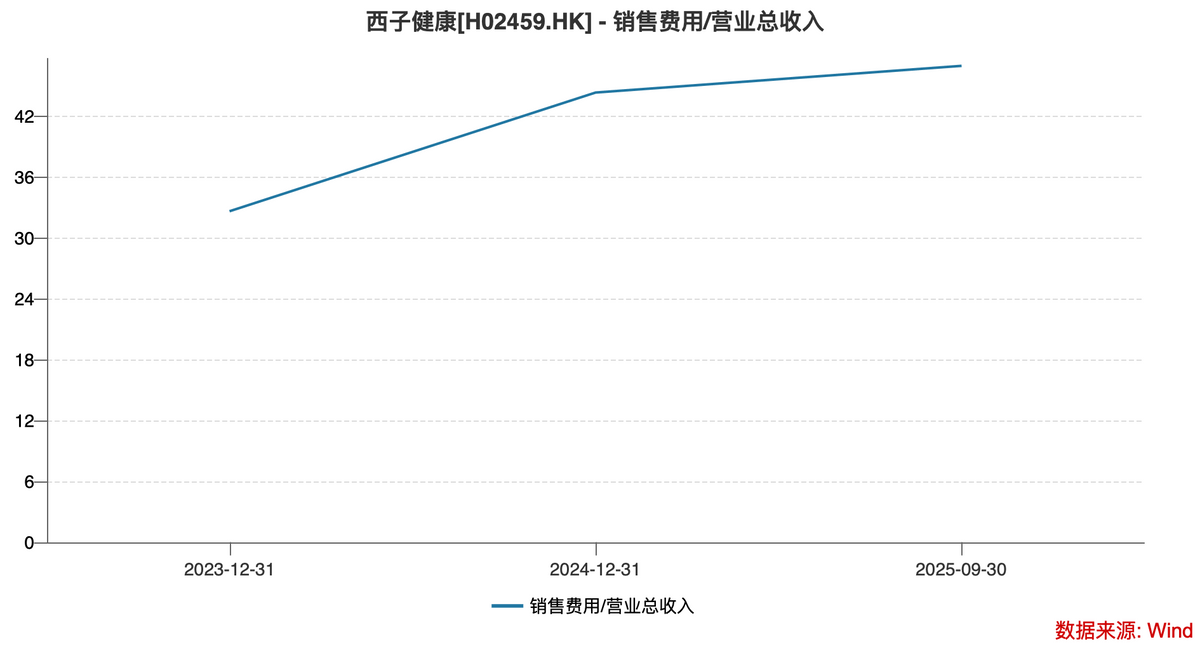 报告期内,西子健康的销售费用一路疯涨:2023年4.72亿元,2025年前三季度直接涨到7.56亿元,销售费用率从32.7%飙升至47%。