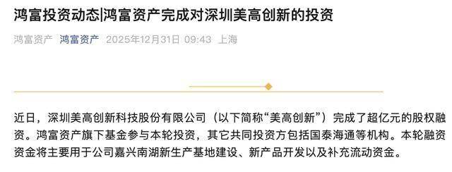 值得一提的是,2025年12月,美高创新完成了超亿元的股权融资。鸿富资产旗下基金参与本轮投资,其它共同投资方包括国泰海通等机构。本轮融资资金将主要用于公司嘉兴南湖新生产基地建设、新产品开发以及补充流动资金。