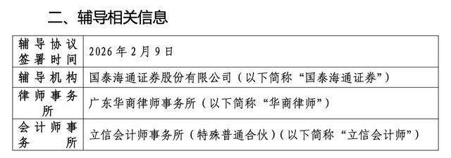 本次IPO的辅导机构为国泰海通证券股份有限公司,律师事务所为广东华商律师事务所,会计师事务所为立信会计师事务所(特殊普通合伙) 。