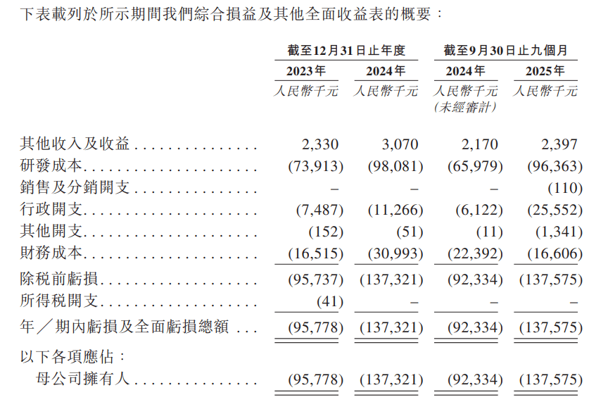 展望未来,公司预计将持续录得亏损,且随着公司加大研发投入和加强销售及营销活动,预计亏损可能会增加。截至2023年及2024年12月31日止年度以及截至2025年9月30日止九个月,公司经营活动所用的净现金流量分别为人民币60.9百万元、人民币104.1百万元及人民币90.8百万元。