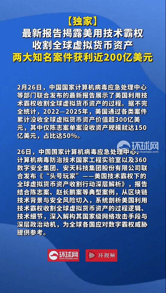 2月26日,中国国家计算机病毒应急处理中心等部门联合发布的最新报告展示了美国利用技术霸权收割全球虚拟货币资产的过程。据不完全统计,2022—2025年,美国通过各类案件累计没收全球虚拟货币资产价值超300亿美元,其中仅陈志案单案没收资产规模就达150亿美元,占比达50%。