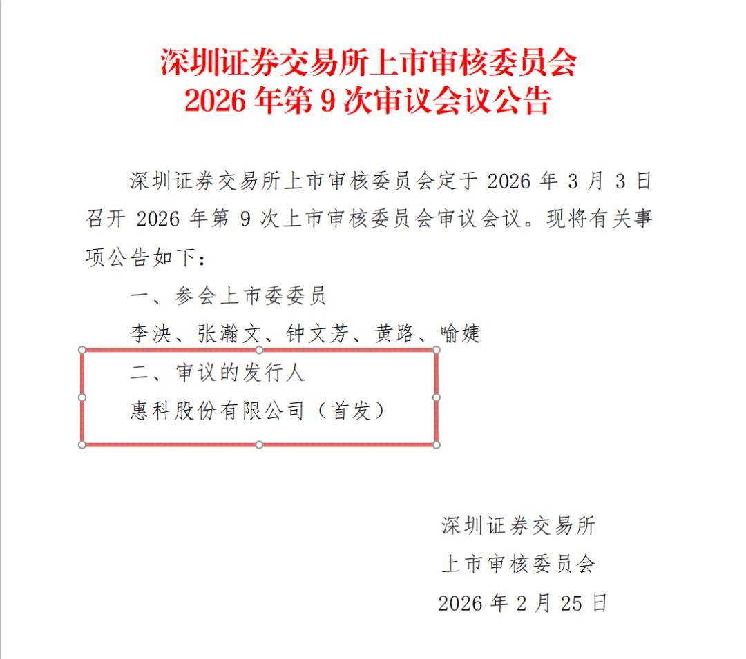 2月25日,据深交所网站披露,深交所上市审核委员会定于3月3日召开2026年第9次上市审核委员会审议会议,届时将审议惠科股份有限公司的首发事项。