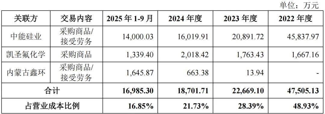 报告期期初,发行人徐州产线生产所需三氯氢硅主要委托中能硅业加工,2022 年及 2023 年向中能硅业采购三氯氢硅金额分别为 28,564.90 万元、3,384.69万元,占各期营业成本的比例分别为 29.42%、4.24%。发行人徐州产线自建三氯氢硅生产线于 2022 年底建设完成并开始投入使用,2023 年三氯氢硅关联采购金额及占比大幅下降。随着发行人徐州产线的三氯氢硅生产线逐渐达到稳定满产状态,2023 年 5 月后已不再委托中能硅业加工三氯氢硅。2025 年 9 月,因公司冷氢化产线停产检修,公司临时向中能硅业采购少量三氯氢硅,采购金额 600.66万元。