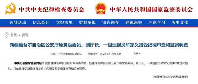 据新疆维吾尔自治区纪委监委消息:新疆维吾尔自治区公安厅原党委委员、副厅长、一级巡视员牟宗义涉嫌严重违纪违法,目前正接受新疆维吾尔自治区纪委监委纪律审查和监察调查。