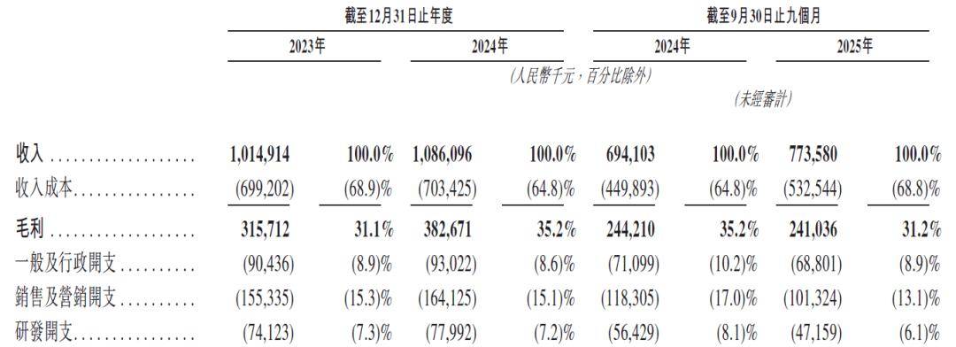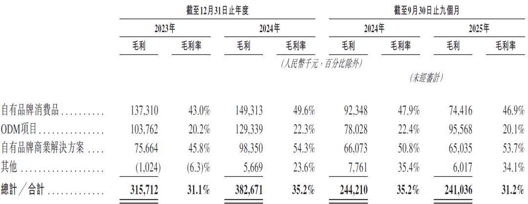 2023年至2025年前三季度,其ODM业务收入占比从50.6%一路攀升至61.6%,已然成为营收支柱。与此相反,代表核心品牌竞争力的自有品牌消费品收入,不仅在2025年前三季度同比下滑,其收入占比更从31.5%萎缩至20.5%。