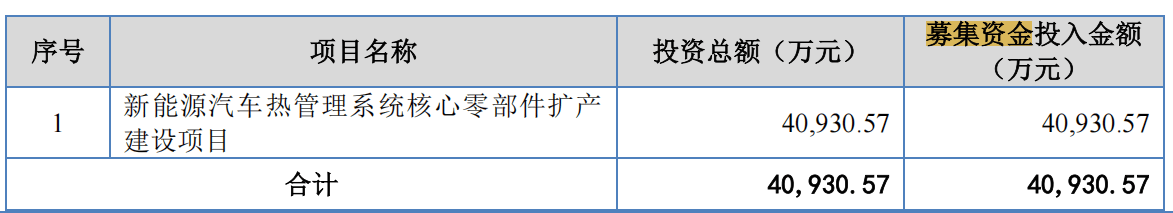 招股书披露,此次IPO,新富科技计划募集资金4.1亿元,将全部用于新能源汽车热管理系统核心零部件扩产建设项目。