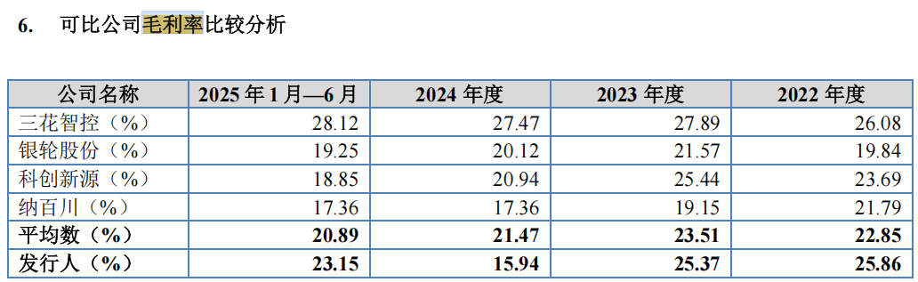 报告期内,新富科技的毛利率分别为25.86%、25.37%、15.94%和23.15%,同期可比公司的毛利率分别为22.85%、23.51%、21.47%和20.89%。可见,与同行可比公司的毛利率均值对比,新富科技的毛利率总体在下降,而且在2024年出现了大幅波动。