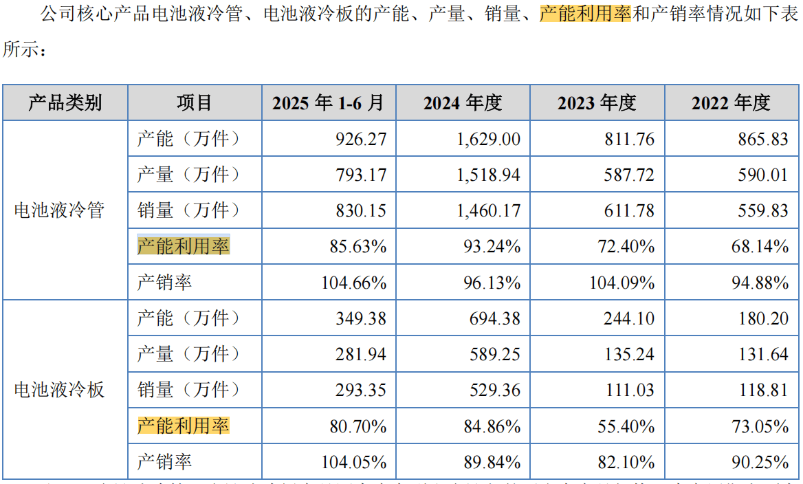 从2022年至2024年以及2025年1-6月份(以下简称报告期),新富科技的电池液冷管的产能利用率分别为68.14%、72.40%、93.24%和85.15%,同期电池液冷板的产能利用率分别为73.05%、55.40%、84.86%和80.70%。