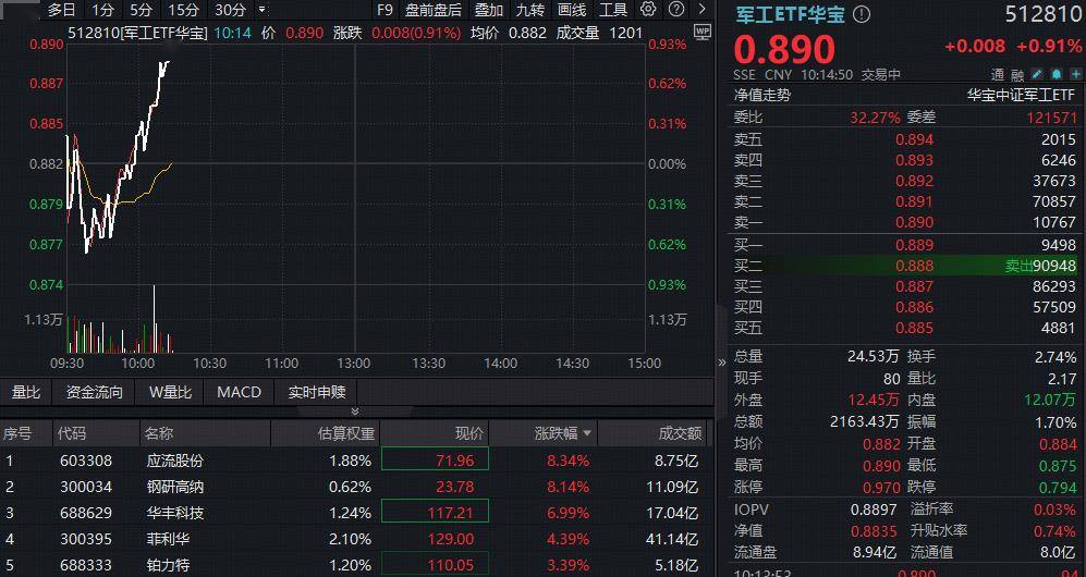 2月26日早盘,军工板块异动拉升,高人气军工ETF华宝(512810)水下拉起,直线冲涨近1%,日线冲击五连阳。成份股钢研高纳领涨逾9%,菲利华续涨逾4%股价再创历史新高!