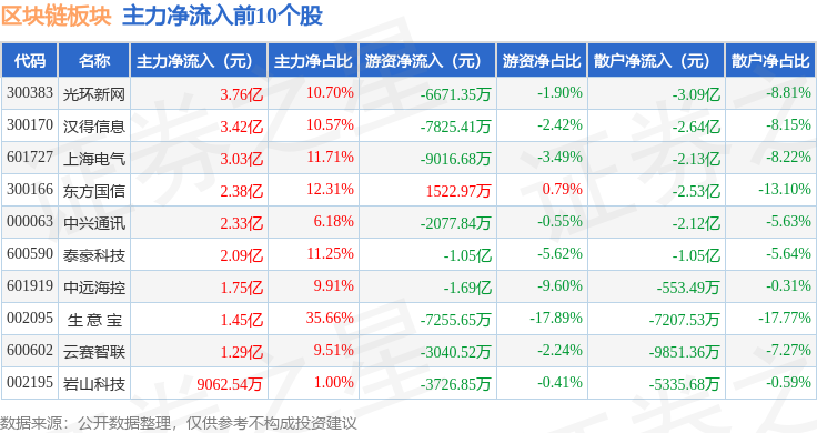 从资金流向上来看,当日区块链板块主力资金净流出41.78亿元,游资资金净流入12.12亿元,散户资金净流入29.66亿元。区块链板块个股资金流向见下表: