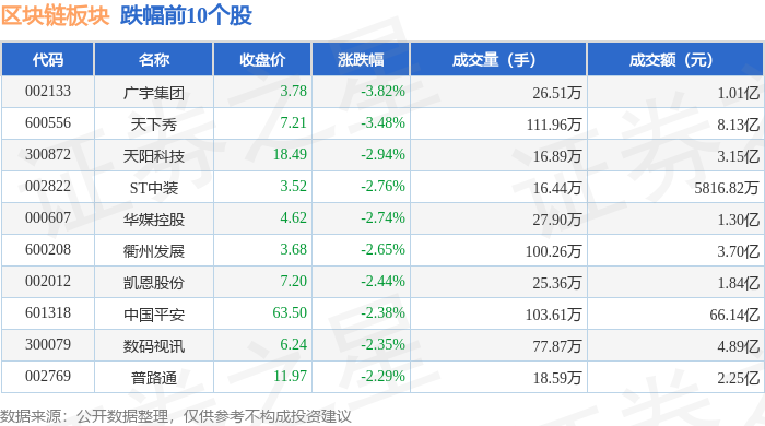 证券之星消息,2月26日区块链板块较上一交易日下跌0.35%,广宇集团领跌。当日上证指数报收于4146.63,下跌0.01%。深证成指报收于14503.79,上涨0.19%。区块链板块个股涨跌见下表: