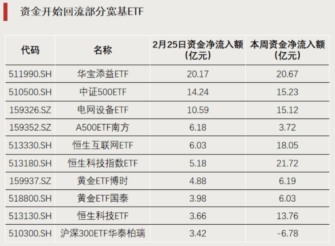 前一交易日(2月25日),资金开始回流中证500ETF(510500)、A500ETF南方(159352)、沪深300ETF华泰柏瑞(510300)等宽基ETF。