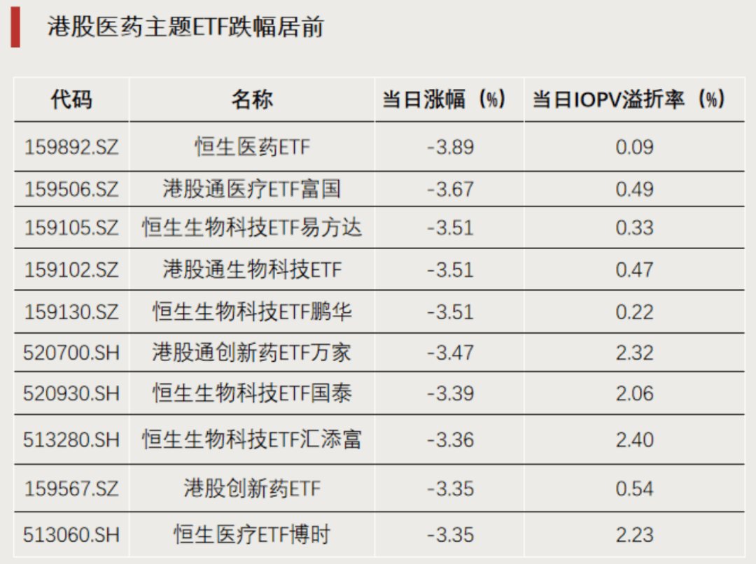 影视院线、保险、房地产等板块跌幅居前,港股医药板块大幅下挫,多只港股医药主题ETF跌超3%。
