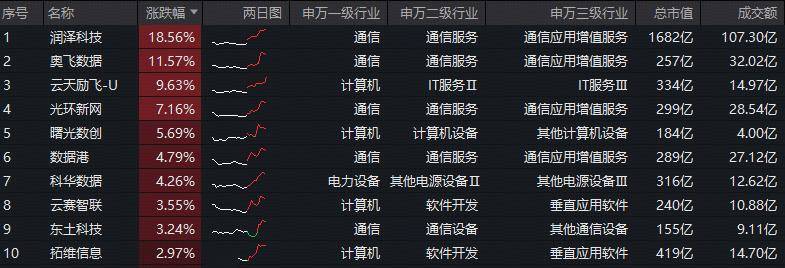 成份股方面,润泽科技领涨超18%,奥飞数据涨逾11%,云天励飞涨超9%,光环新网涨超7%,曙光数创、数据港、科华数据、云赛智联、东土科技等个股跟涨。