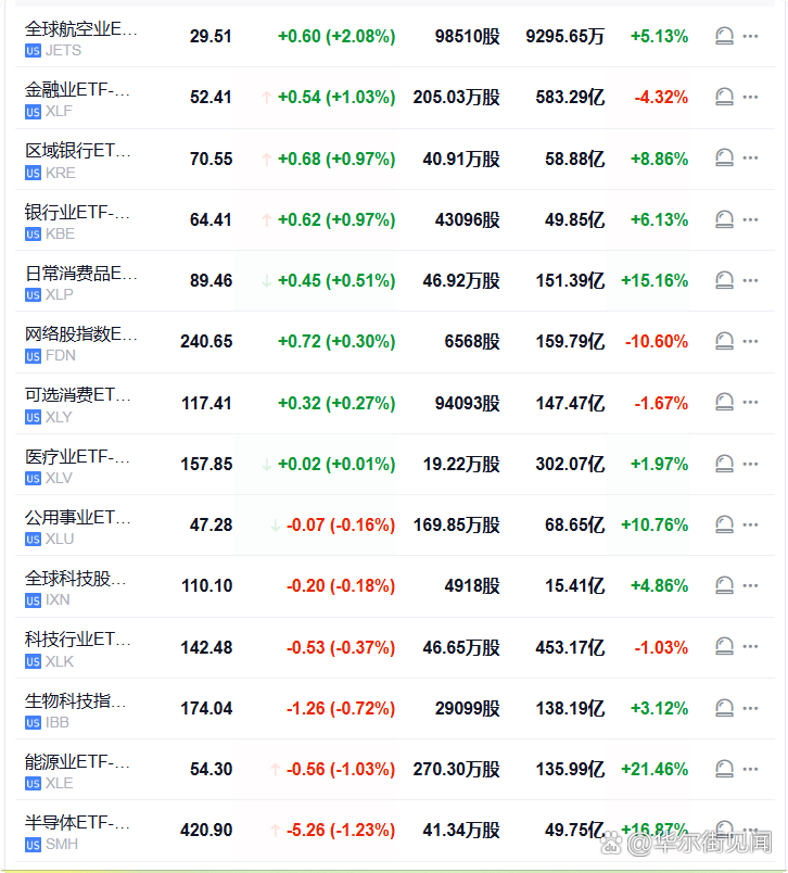全球航空业ETF涨2.08%,金融业ETF涨1.03%,在美股盘初领跑行业ETF,能源业ETF跌1.03%,半导体指数跌1.22%。