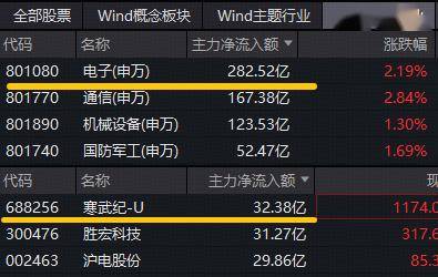 资金面上,电子板块获主力资金净流入282亿元,板块吸金额高居31个申万一级行业首位寒武纪狂揽32亿元,霸居A股吸金榜第一。