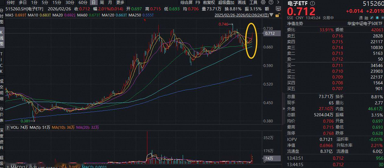 今日(2月26日)英伟达产业链含量近28%的电子ETF(515260)震荡拉升,场内价格盘中涨近2.3%,现涨2.01%,冲击日线5连阳!