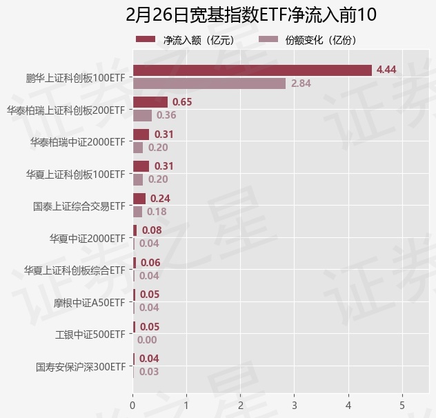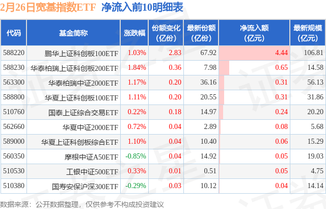 当日有11只宽基指数ETF基金出现资金净流入,其中净流入排首位的是鹏华上证科创板100ETF(588220),份额增加了2.83亿份,净流入额为4.44亿元。