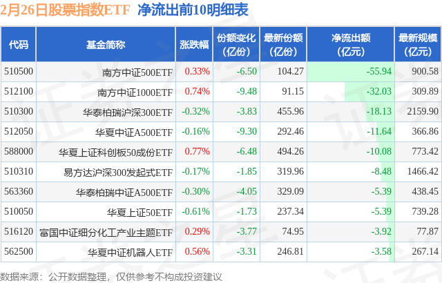 当日有324只股票指数ETF基金出现资金净流出,其中净流出排首位的是南方中证500ETF(510500),份额减少了6.5亿份,净流出额为55.94亿元。