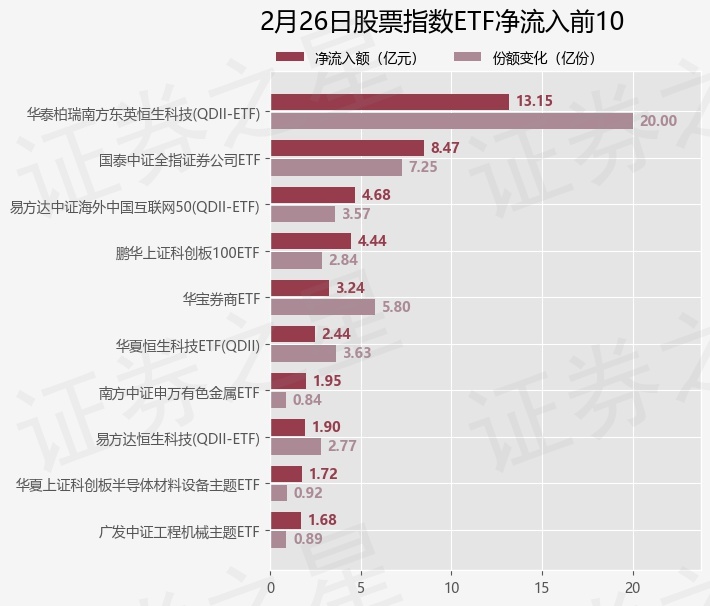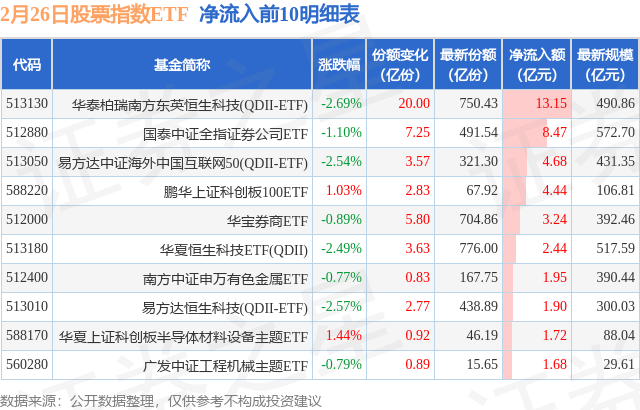 当日有144只股票指数ETF基金出现资金净流入,其中净流入排首位的是华泰柏瑞南方东英恒生科技(QDII-ETF)(513130),份额增加了20.0亿份,净流入额为13.15亿元。