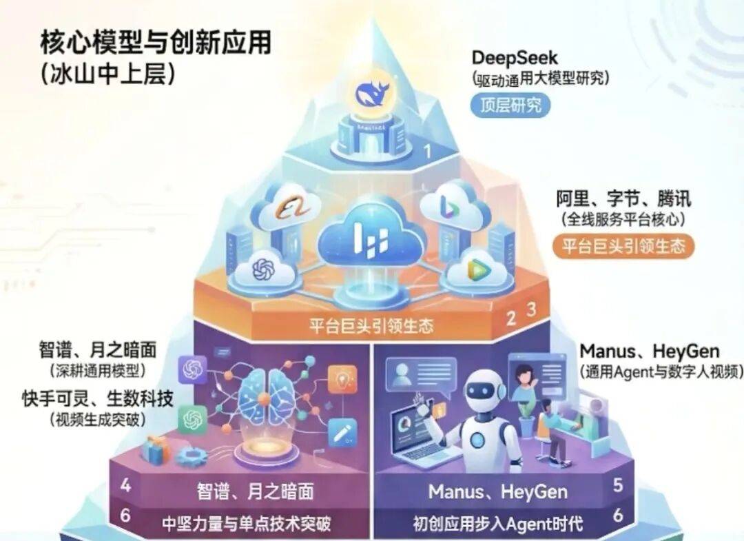 顶层是超级玩家,由少数统治级开源基座打造,如DeepSeek,提供基础AI能力,创业公司已难介入。