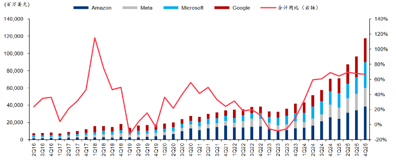 从前期北美财报看,4Q25 MAMG(微软、亚马逊、Meta、谷歌)合计资本开支同比增长66.64%至1176亿美元。 从2026年指引看,Meta指引约1150亿~1350亿美元的区间,同比增长59%~87%;谷歌指引1750亿~1850亿美元之间,同比接近倍增;2026年资本开支指引约2000亿美元,同比+50%。北美四大云厂2026年资本开支指引合计超6600亿美元,增速超过60%。
