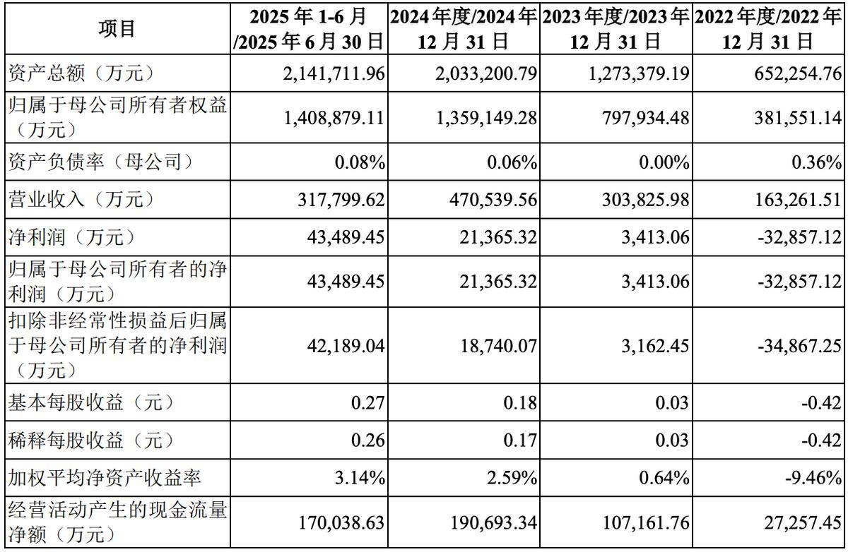 2022年、2023年、2024年度和2025年上半年,盛合晶微的营收分别约为16.33亿元、30.38亿元、47.05亿元和31.78亿元,净利润分别约-3.29亿元、3413.06万元、2.14亿元和4.35亿元,扣非后净利润分别分别约-3.49亿元、3162.45万元、1.87亿元和4.22亿元。