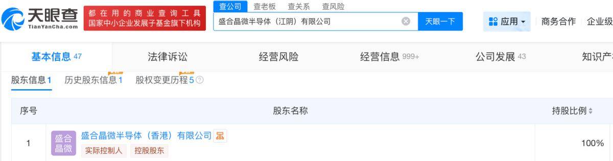 天眼查App信息显示,盛合晶微成立于2014年11月,前称为中芯长电半导体(江阴)有限公司。目前,该公司的注册资本为15.4亿美元,法定代表人为崔东,由盛合晶微半导体(香港)有限公司全资控制。