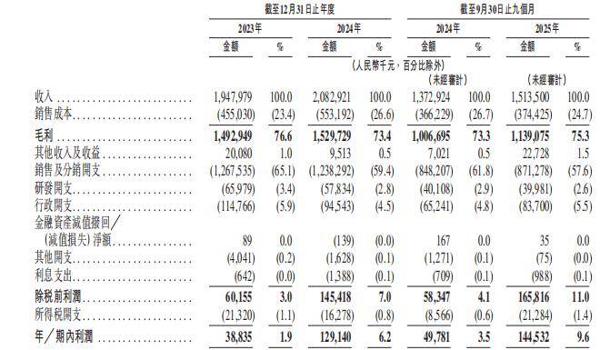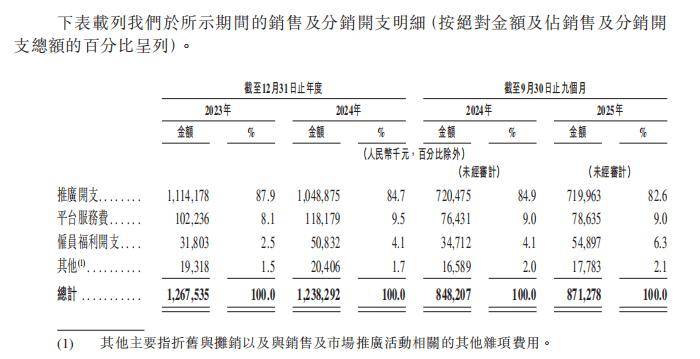 招股书销售及分销开支占总收入比重2023年为65.1%,2024年为59.4%,截至2024年9月30日止9个月为61.8%,截至2025年9月30日止9个月为57.6%。同期推广开支占总收入比例,在2023年为57.2%,2024年为50.4%,截至2024年9月30日止9个月为52.5%,截至2025年9月30日止9个月为47.6%。