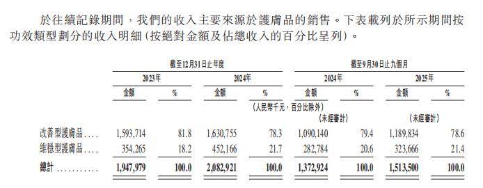 产品结构方面,改善型护肤品收入占比在2023年为81.8%,2024年为78.3%,截至2024年9月30日止9个月为79.4%,截至2025年9月30日止9个月为78.6%。维稳型护肤品收入占比在2023年为18.2%,2024年为21.7%,截至2024年9月30日止9个月为20.6%,截至2025年9月30日止9个月为21.4%。这说明护家科技并非只押注单一功效方向,而是在尝试让产品结构更均衡。