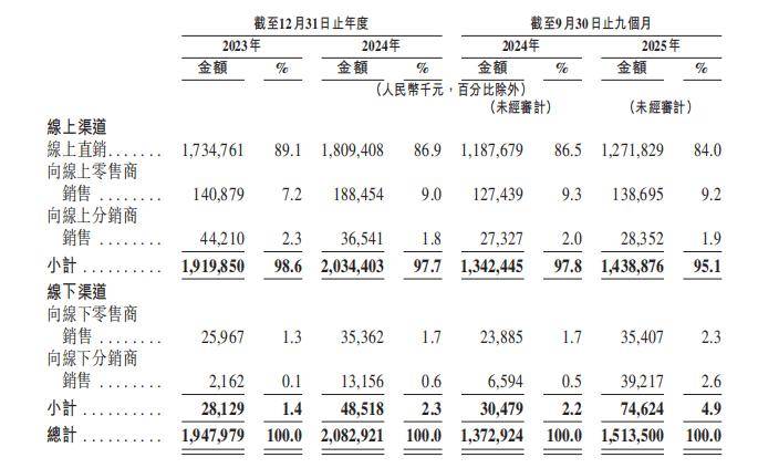 线上内部构成,线上直销占总收入比例2023年为89.1%,2024年为86.9%,截至2024年9月30日止9个月为86.5%,截至2025年9月30日止9个月为84.0%。向线上零售商销售占比在2023年为7.2%,2024年为9.0%,截至2024年9月30日止9个月为9.3%,截至2025年9月30日止9个月为9.2%。