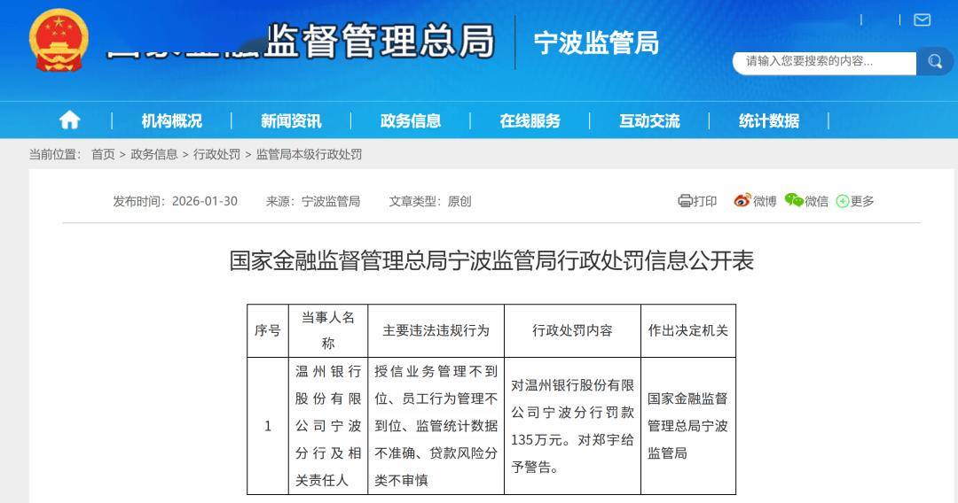 1月30日,国家金融监督管理总局宁波监管局对温州银行宁波分行开出135万元罚单;十天后,金华监管分局再对温州银行金华分行处以130万元罚款。两张罚单如出一辙地指向“员工行为管理不到位”这一核心违规事项,而这已是近一年来温州银行多次涉及的同类问题。