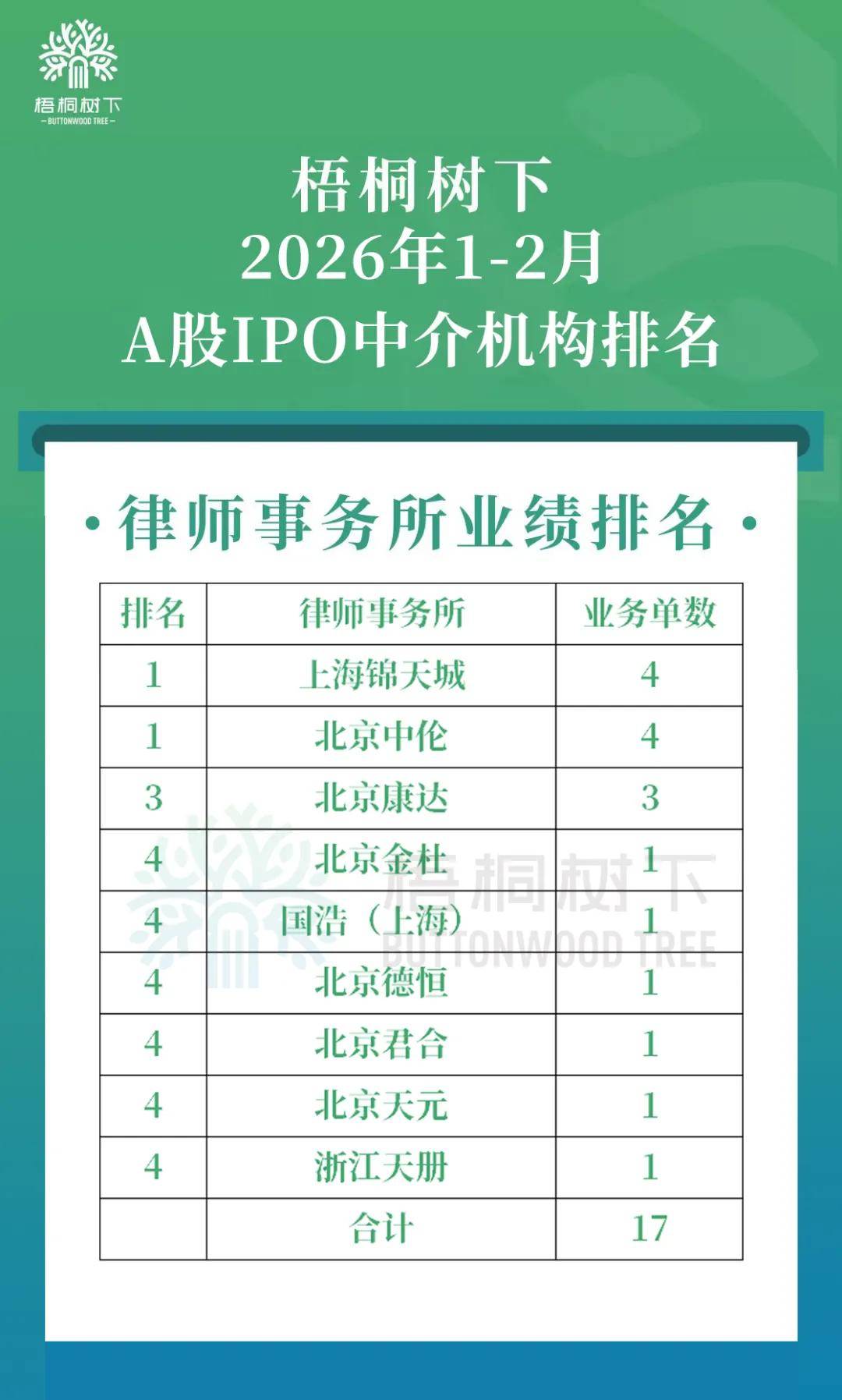 上海锦天城、北京中伦2家律所并列第一,业务单数各4单;