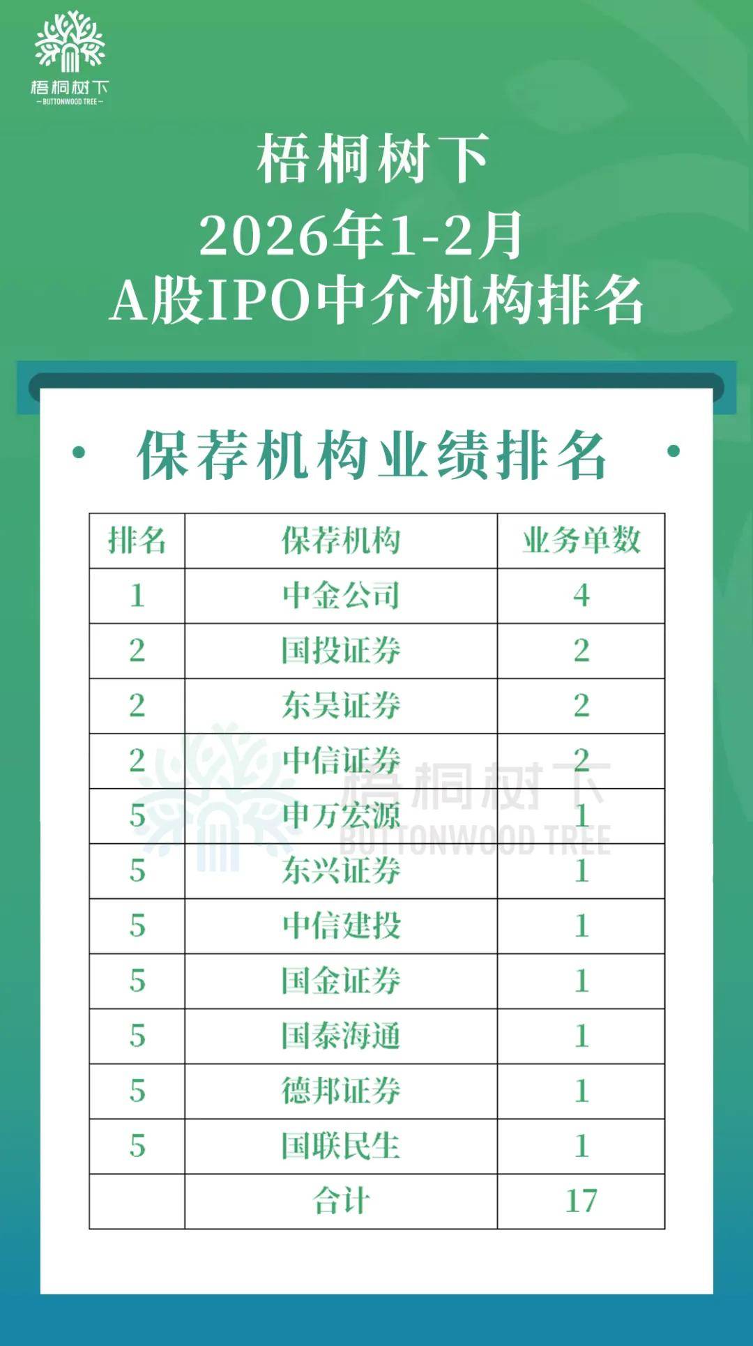 2026年1-2月,共有11家保荐机构承担了这17家新上市公司的IPO上市业务。