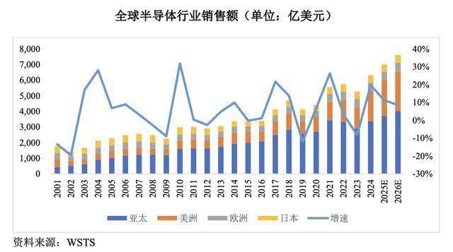 根据WSTS统计,2024年全球半导体市场销售额为6,305.49亿美元。2025年,在新兴市场需求增长、全球经济逐步企稳、通胀放缓以及各国持续出台半导体产业支持政策的推动下,全球半导体市场迎来回暖,预计全年销售额达7,008.74亿美元,同比增长11.15%。展望2026年,市场有望延续增长态势,预计市场规模将攀升至7,607.00亿美元,较2025年增长8.54%。