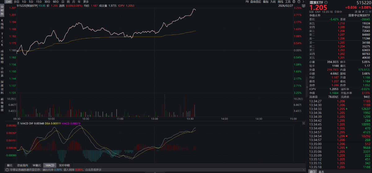 2月27日,受海外印尼煤矿扰动等影响,煤炭ETF(515220)盘中大涨超3%。