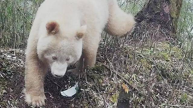 侯蓉表示,2019年四川卧龙国家级自然保护区曾在保护区内海拔2000米左右的野外红外触发式相机中摄录下一张大熊猫的影像。图片清晰显示,该大熊猫通体毛发呈白色,爪子也呈白色,而眼睛为红色。以此分析,该个体的白化或因基因突变导致。