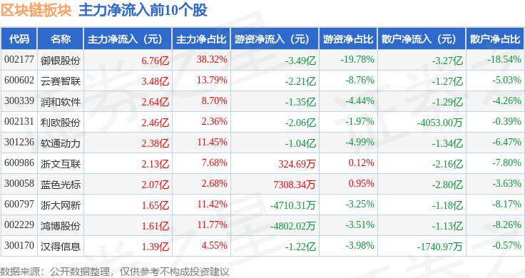 从资金流向上来看,当日区块链板块主力资金净流入23.2亿元,游资资金净流出17.05亿元,散户资金净流出6.15亿元。区块链板块个股资金流向见下表: